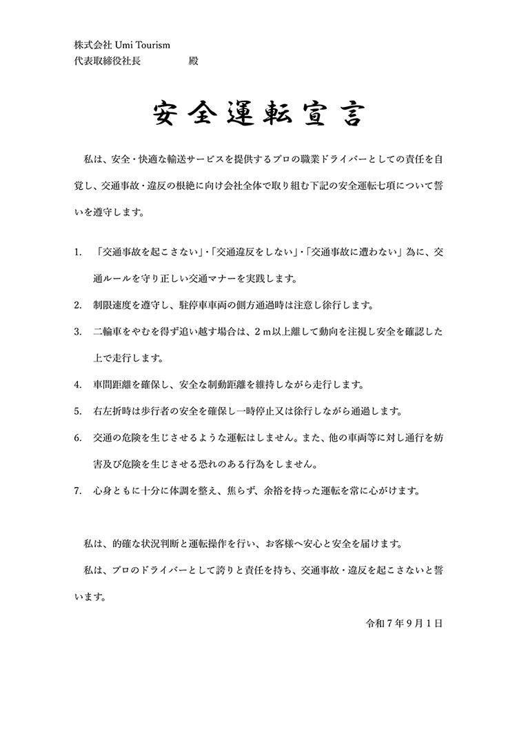 (株)Umi Tourismでは、社会的責任を果たす取り組みとして、交通ルールの理解を深め危険予知能力を高めることで事故のリスクを減らし、交通事故の予防や安全運転の推進に向け取り組んでいます。