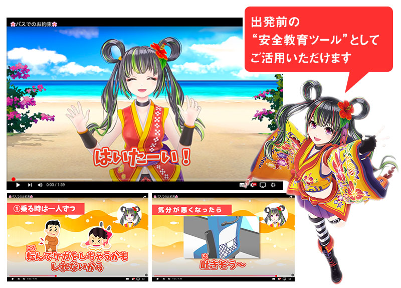 この動画は、沖縄発のバーチャルタレント「根間うい」を起用した約3分のCGアニメーションで、出発前に車内モニターで「バスでのお約束」を”楽しく分かりやすく”お伝えします。